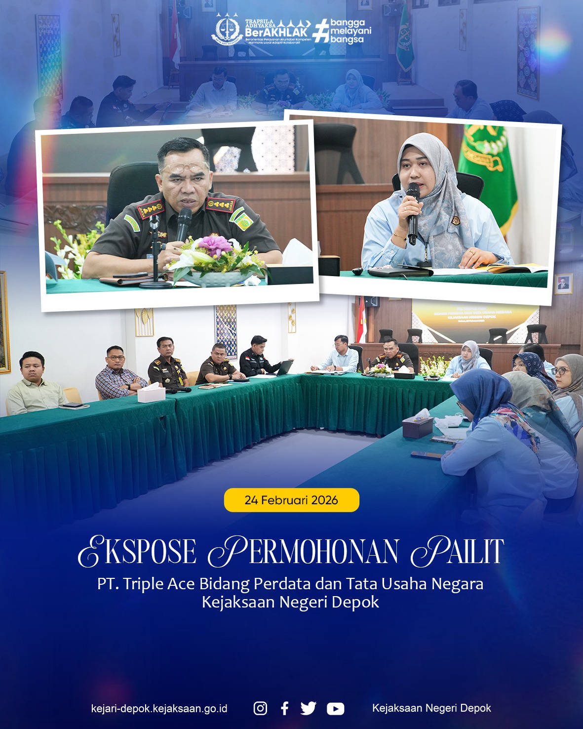 Depok (24/02/2026) Kepala Kejaksaan Negeri Depok Dr. Arif Budiman, S.H., M.H. bersama Kasubagbin, Para Kepala Seksi beserta Jaksa Pengacara Negara (JPN) Kejaksaan Negeri Depok mengikuti kegiatan Ekspose Permohonan Pailit PT. Triple Ace oleh Bidang Perdata dan Tata Usaha Negara Kejaksaan Negeri Depok bertempat di Aula Kejaksaan Negeri Depok.