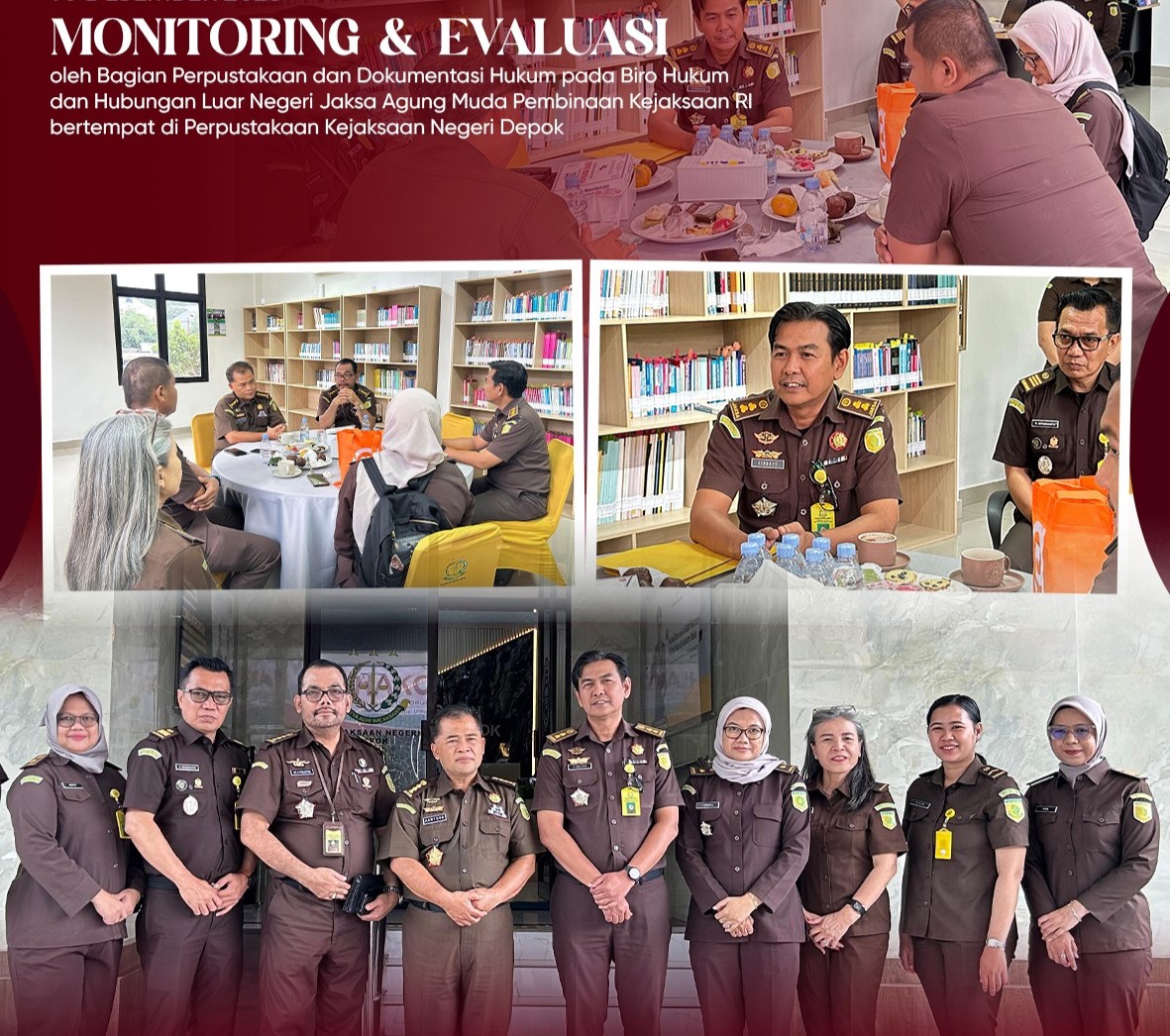 Depok, (10/12/2025) Kepala Sub Bagian Pembinaan, Firdaus, S.H., M.H. bersama Staf Bidang Pembinaan Kejaksaan Negeri Depok mengikuti Kegiatan Monitoring dan Evaluasi Pengelolaan Perpustakaan dan Dokumentasi Hukum pada Perpustakaan Unit di tingkat Kejaksaan Tinggi dan tingkat Kejaksaan Negeri oleh Perpustakaan Pusat (Kejaksaan Agung) pada Bagian Perpustakaan dan Dokumentasi Hukum pada Biro Hukum dan Hubungan Luar Negeri, Jaksa Agung Muda Pembinaan Kejaksaan RI bertempat di Perpustakaan Kejaksaan Negeri Depok.