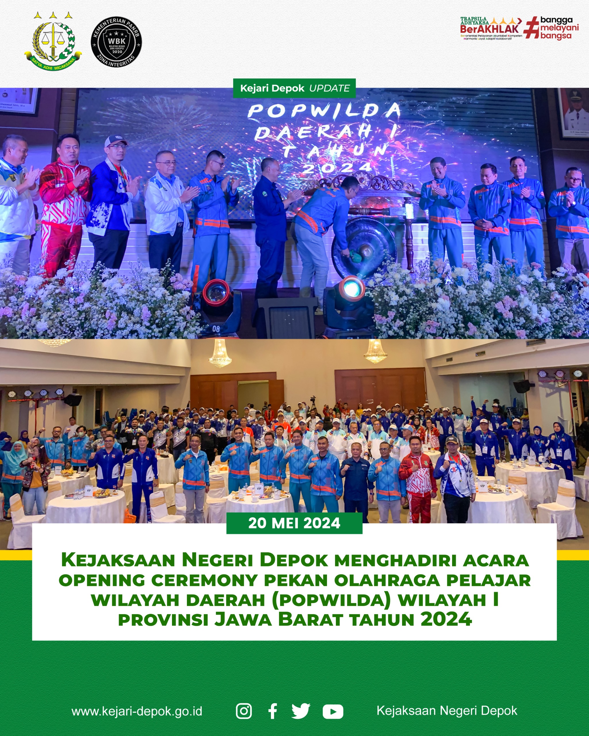 Senin (20/05/2024) Kejaksaan Negeri Depok menghadiri Acara Opening Ceremony Pekan Olahraga Pelajar Wilayah Daerah (POPWILDA) Wilayah I Provinsi Jawa Barat Tahun 2024 bertempat di Gedung Dibaleka 2 Balaikota Depok.