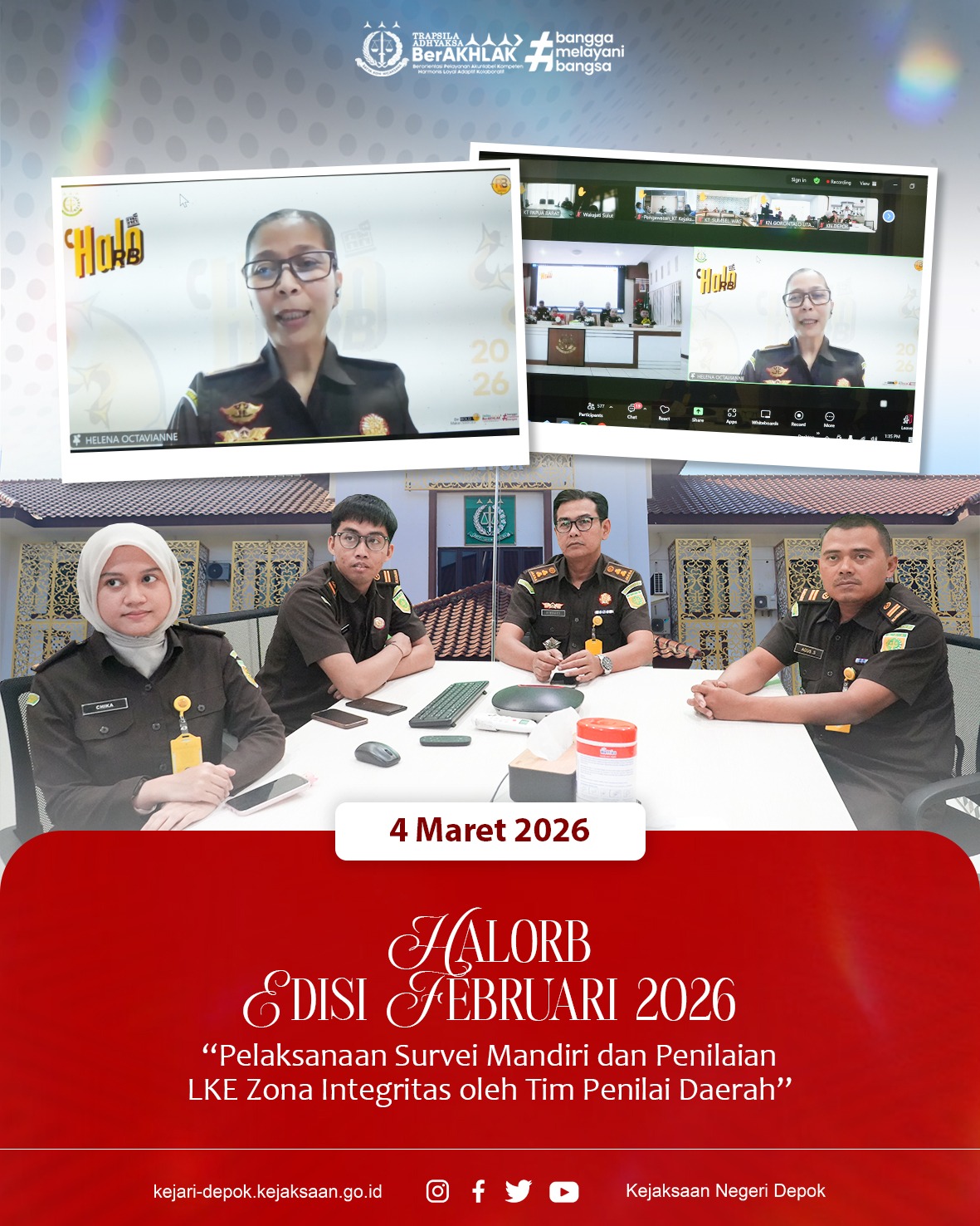 Depok (04/02/2026) Kepala Sub Bagian Pembinaan Kejaksaan Negeri Depok, Firdaus, S.H., M.H didampingi Staf Pembinaan Kejaksaan Negeri Depok mengikuti HaloRB Edisi Maret 2026 dengan Topik : Pelaksanaan Survei Mandiri dan Penilaian LKE Zona Integritas oleh Tim Penilai Daerah secara daring melalui zoom meeting.