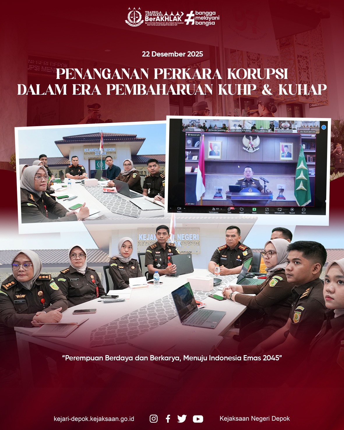Depok, (22/12/2025) Kepala Kejaksaan Negeri Depok, Dr. Arif Budiman, S.H., M.H bersama Kepala Seksi Tindak Pidana Khusus, Dr. Mohammad Ihsan Pasamula, S.H., M.H beserta Kasubsi dan Staf mengikuti kegiatan Penanganan Perkara Korupsi dalam Era Pembaharuan KUHP dan KUHAP secara Virtual melalui Video Conference.