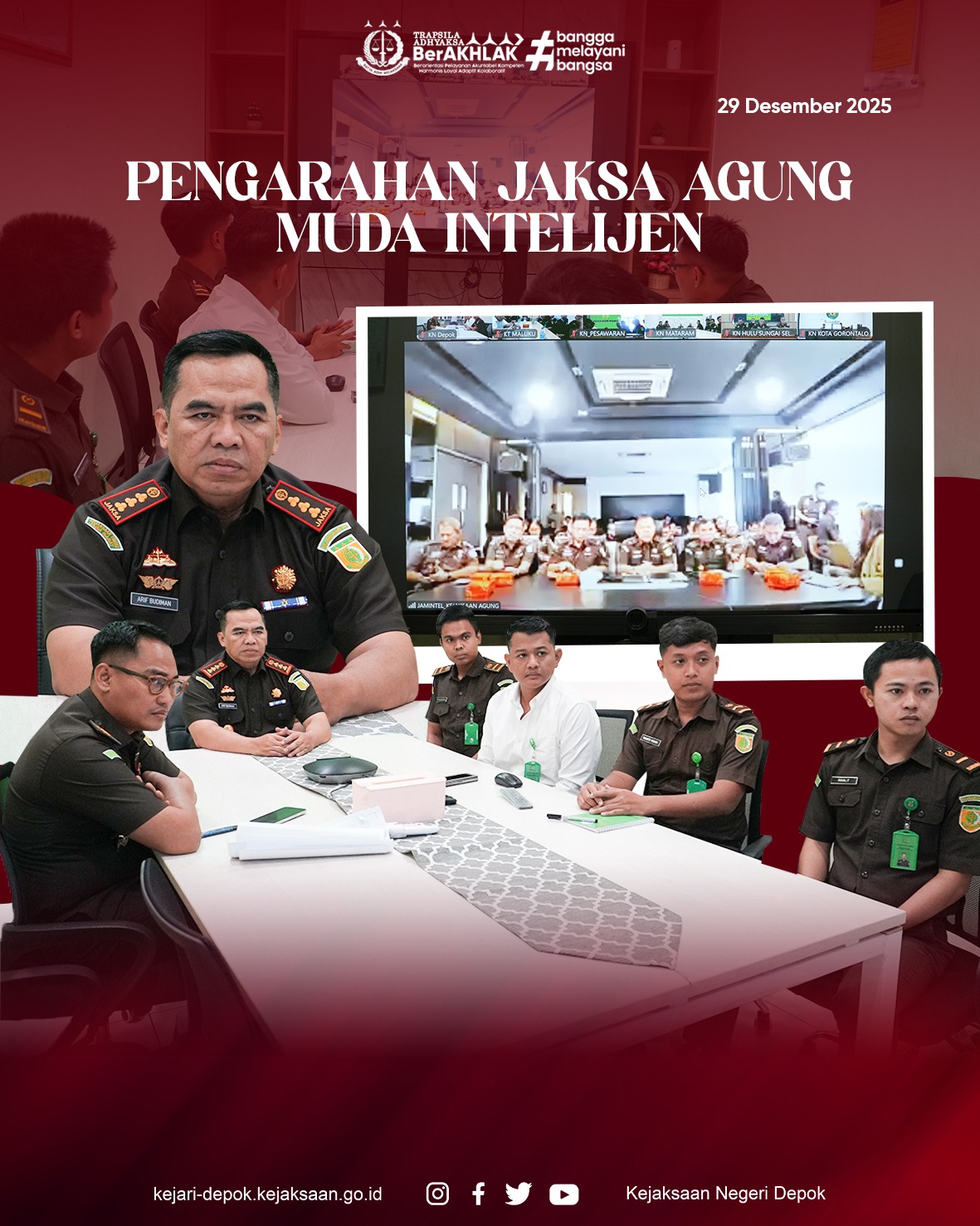 Depok, (29/12/2025) Kepala Kejaksaan Negeri Depok, Dr. Arif Budiman, S.H., M.H didampingi Kepala Seksi Intelijen, Barkah Dwi Hatmoko, S.H., M.H beserta Kasubsi dan Staf Intelijen mengikuti kegiatan “Pengarahan Jaksa Agung Muda Intelijen” yang diselenggarakan secara Virtual melalui Video Conference.