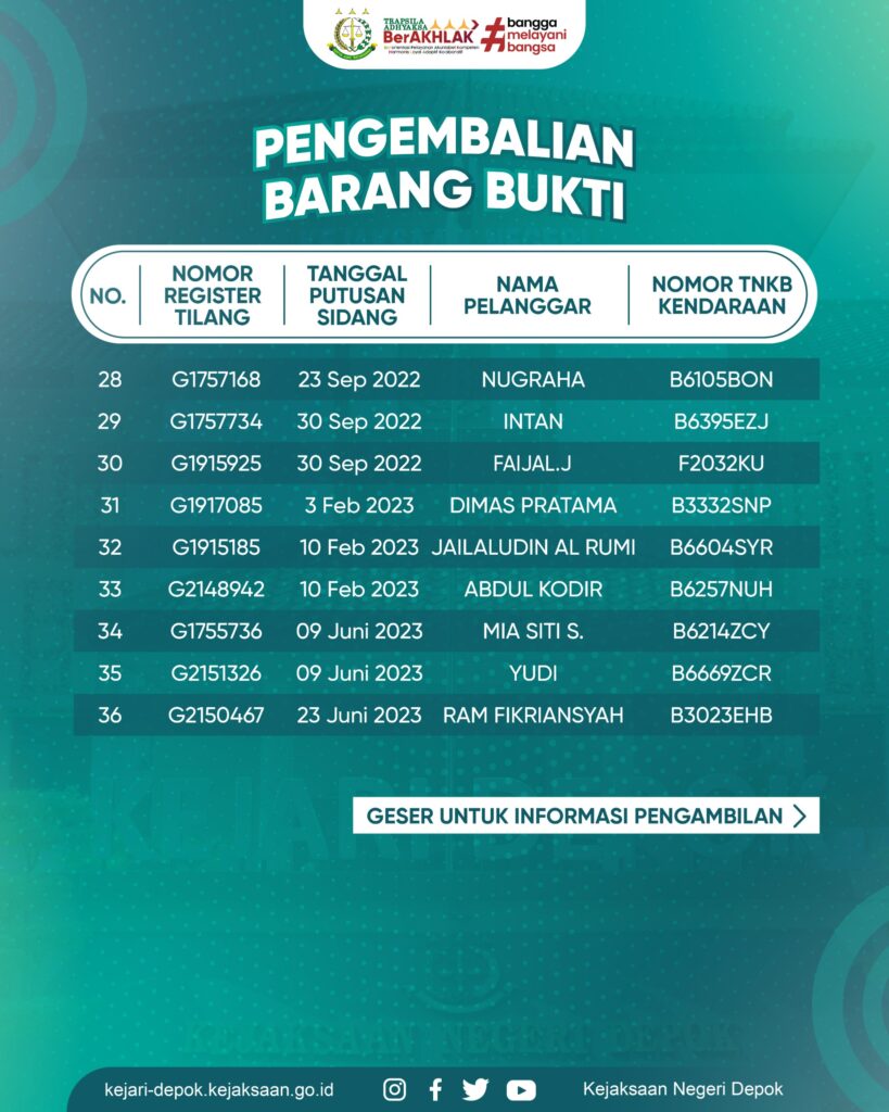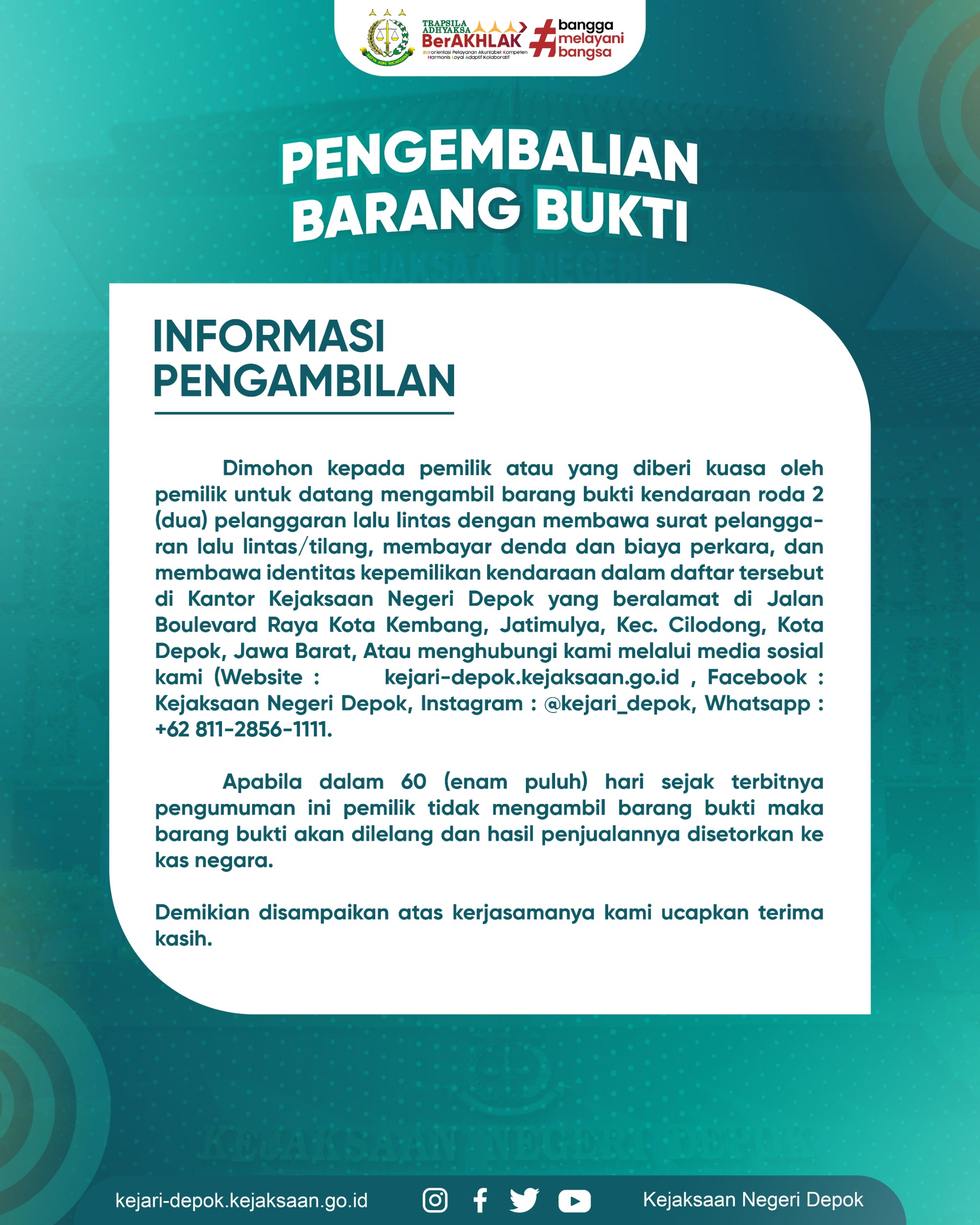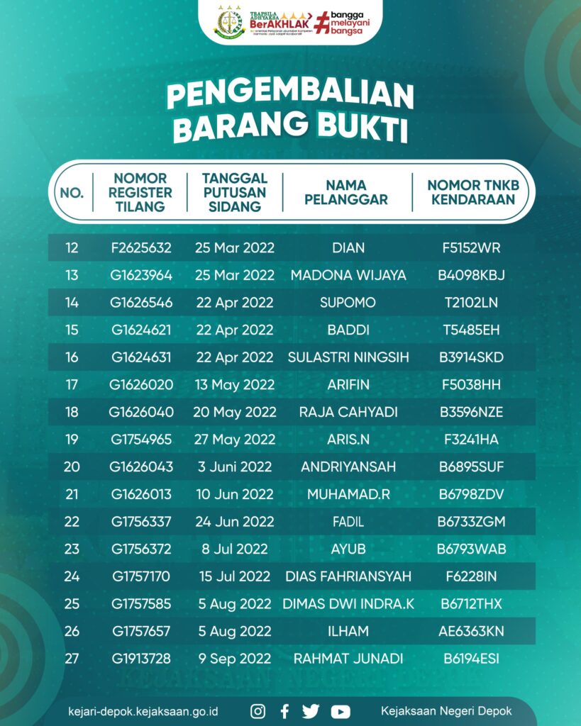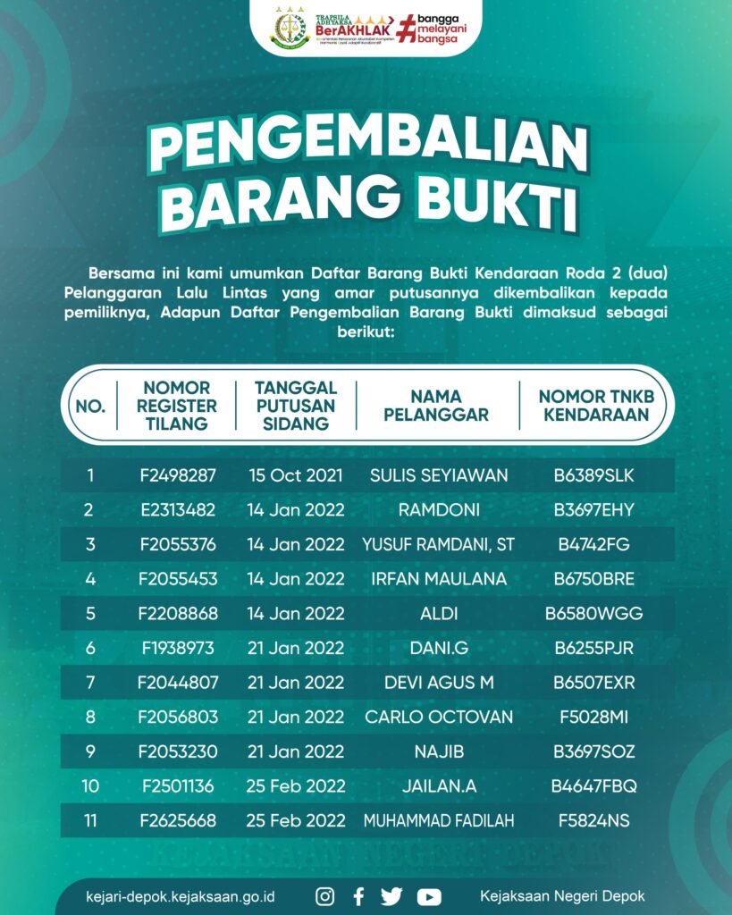 Kejaksaan Negeri Depok mengumumkan daftar kendaraan roda 2 hasil pelanggaran lalu lintas yang berdasarkan putusan pengadilan dengan amar putusan dikembalikan kepada pemiliknya.