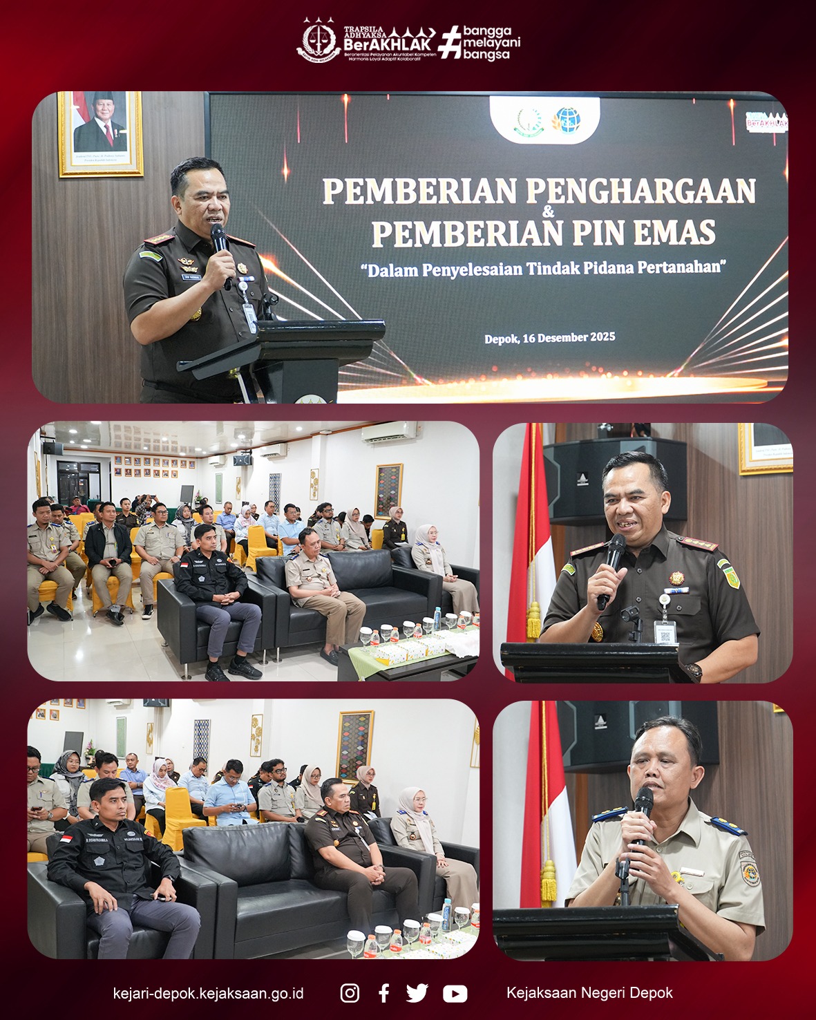 Depok, (16/12/2025) Kepala Kejaksaan Negeri Depok, Dr. Arif Budiman, S.H., M.H menerima Piagam Penghargaan dan Pin Emas “Atas Prestasi Dalam Penyelesaian Target Operasi Utama dan Target Operasi Tambahan Tindak Pidana Pertanahan” yang di berikan langsung oleh Badan Pertanahan Nasional Kota Depok bertempat di Aula Kejaksaan Negeri Depok.