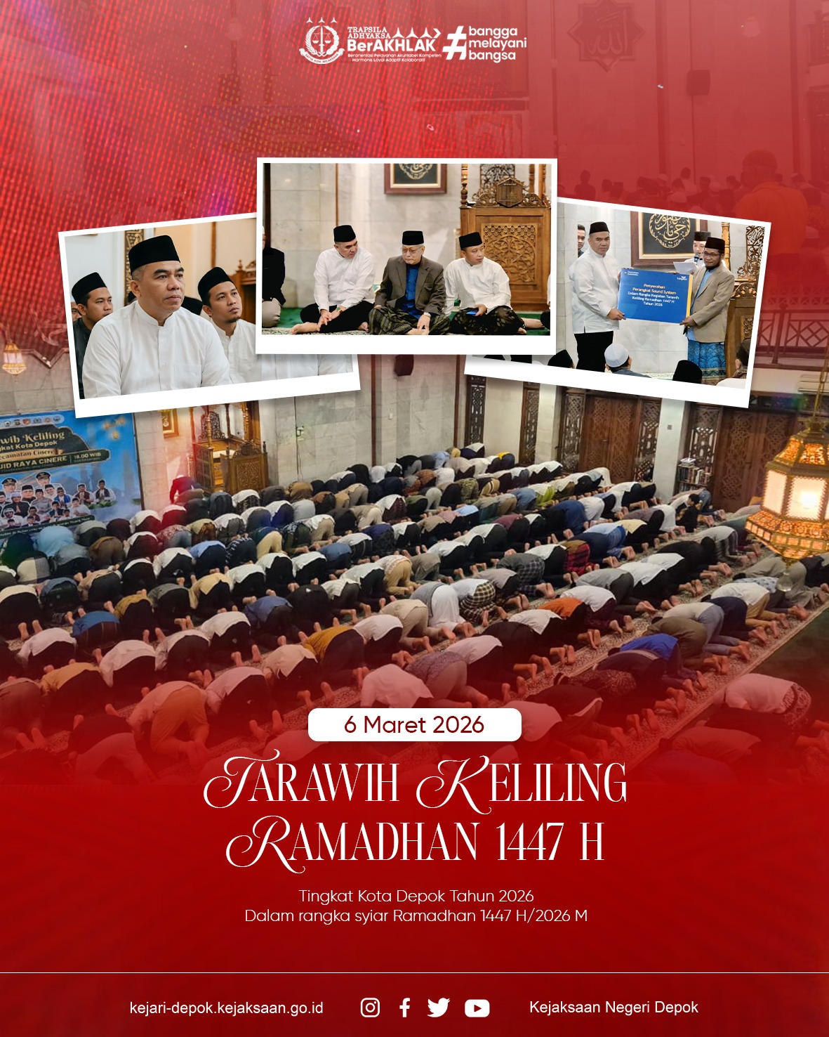 Depok (06/03/2026) Kepala Kejaksaan Negeri Depok, Dr. Arif Budiman, S.H., M.H., bersama Forkopimda Kota Depok mengikuti kegiatan Tarawih Keliling Ramadan 1447 H sekaligus peringatan Nuzulul Quran tingkat Kota Depok Tahun 2026 yang bertempat di Masjid Raya Cinere, Kecamatan Cinere, Kota Depok.